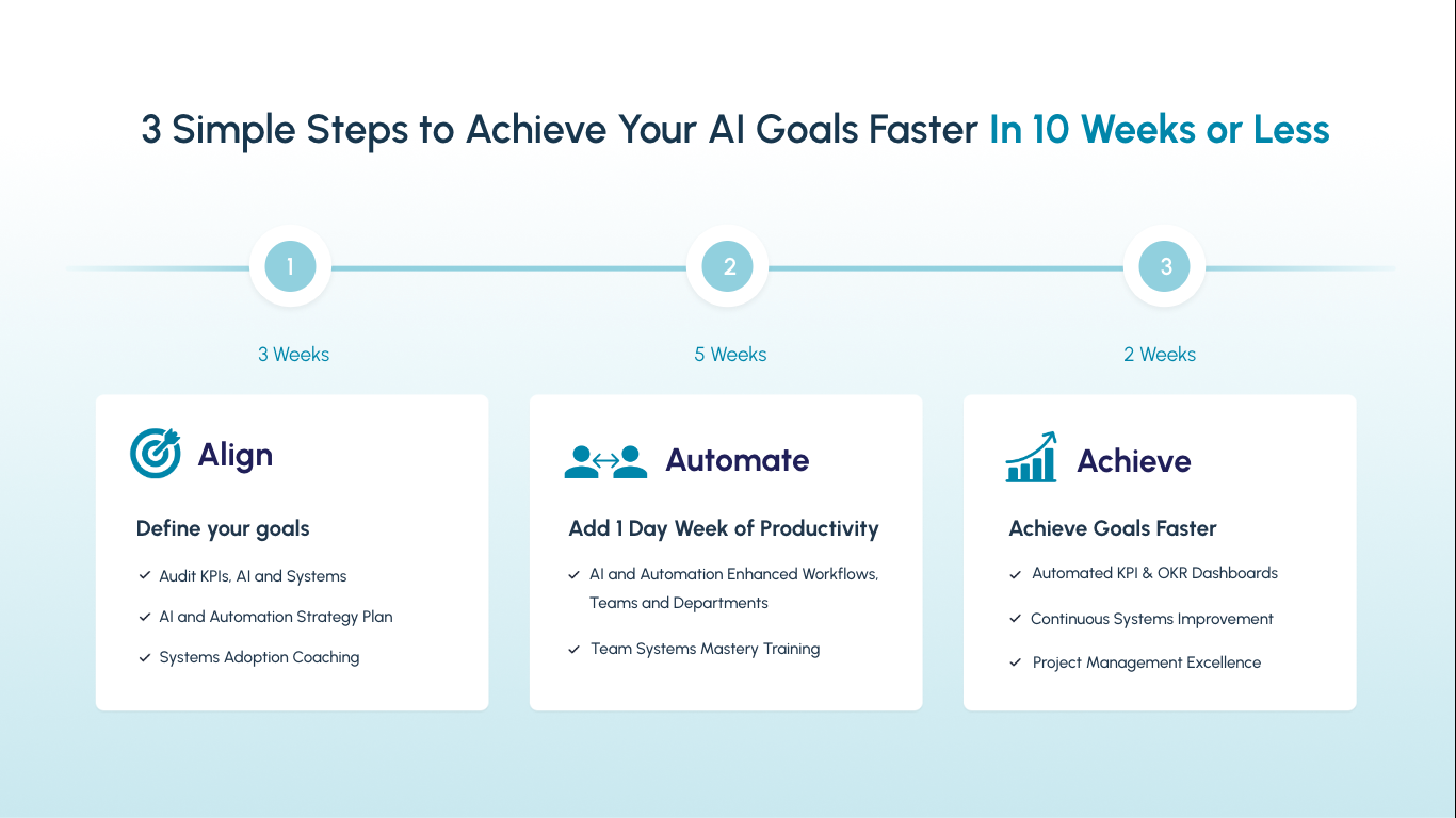 Our Align → Automate → Achieve methodology turns the Automate-Your-Job KPI into a structured, repeatable system that transforms daily workflows across every department.